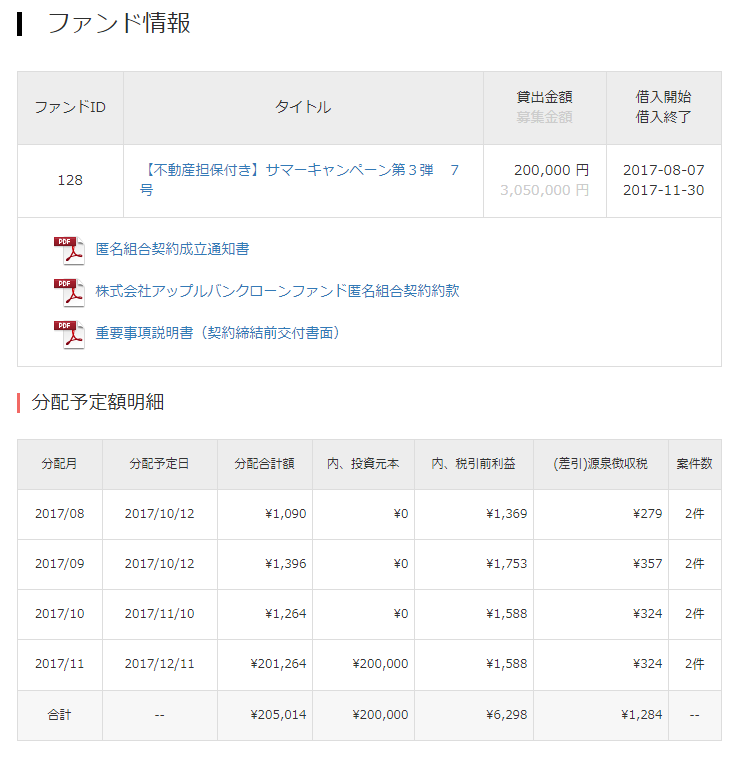 まずはお試しということで、運用期間は短い3ヶ月の案件を選択し、資金20万円からアップルバンクでのソーシャルレンディング投資スタートです。