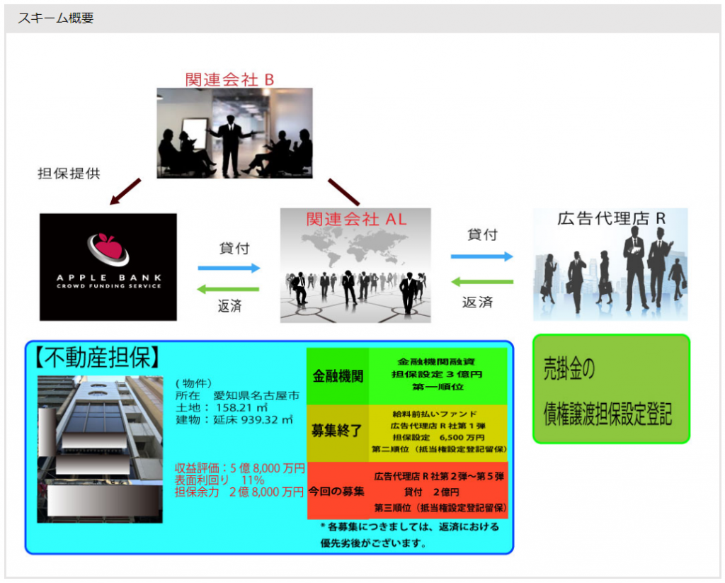 これは注意。担保をどの会社がもっているかっつーのが重要。最近気づいて、アップルバンクは、当分これが修正されないかぎり、追加投資はしない。投資した分は戻ってくる事を祈りますが