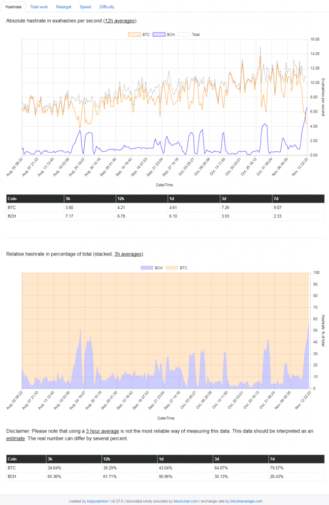 BCHへのマイナーの乗換えでBTCとBCHのハッシュレートが逆転