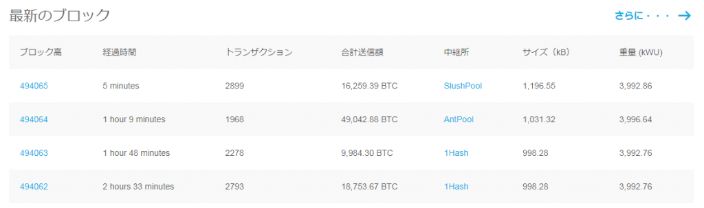 本家ビットコイン(BTC)は1ブロックで二千から三千程度の送金処理が実行されて、ブロック生成間隔(送金処理間隔)は10分程度が通常ですが、急騰したビットコインキャッシュ(BCH)にマイナーが急速に移動して、1時間以上ブロックが生成されない(494064ブロックと次の494065ブロックの間隔が1時間4分)状況が発生しました。