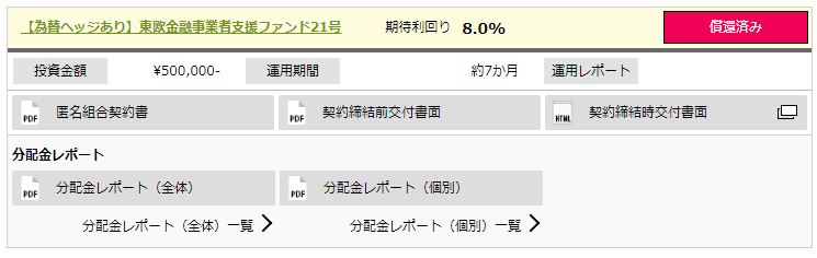東欧金融事業者支援ファンド21号が予定どおり無事に満期一括償還されました。実現利回りは8.3%で運用開始時の期待利回り8.0%よりも好成績でした。