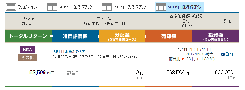 投資元本60万円で1ヶ月弱でプラス10%を超えるパフォーマンスとなっていましたので、深追いし過ぎずに8月下旬に2回に分けて利確を行いました。その結果、63,509円の利益が出まして、更にこの利益がNISAのおかげで非課税でありがたいです。