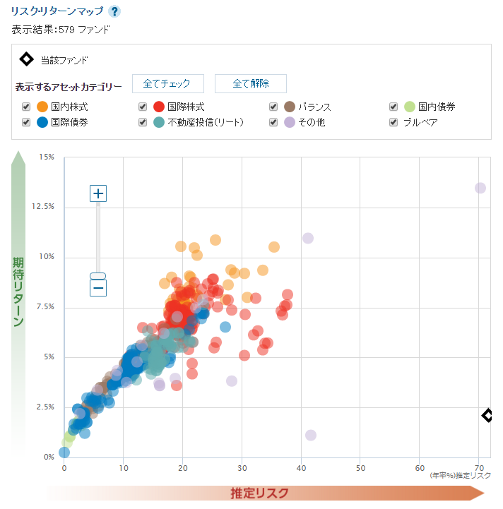 どのファンドにしようか考えていましたが、500種類以上と多くて正直迷いました。8月頭の当時は日経平均が2万円前後で推移し、NYダウも最高値更新をしている時期でしたので、相場が急落するリスクを警戒していました。ということで直近のパフォーマンスはマイナスでリスクリターンマップの右下で他のファンドとはかなり離れたポジションにあるファンド「SBI日本株3.7ベア」を選択し、NISA枠の半分の60万円分を8月3日に購入しました。
