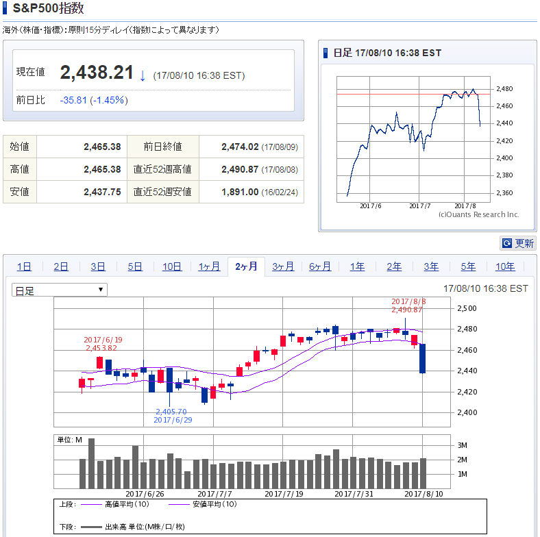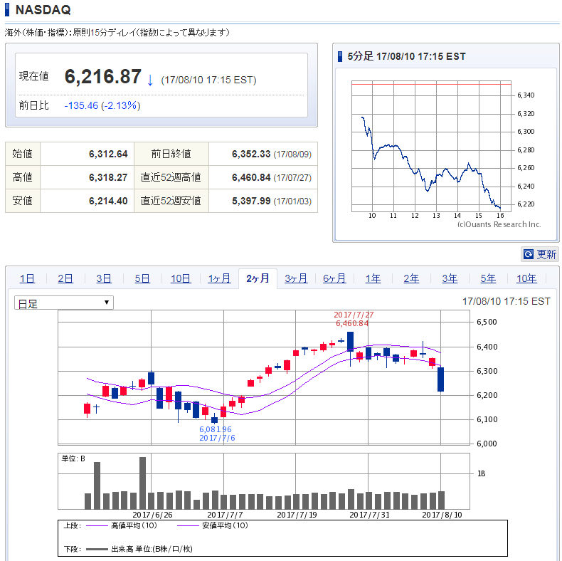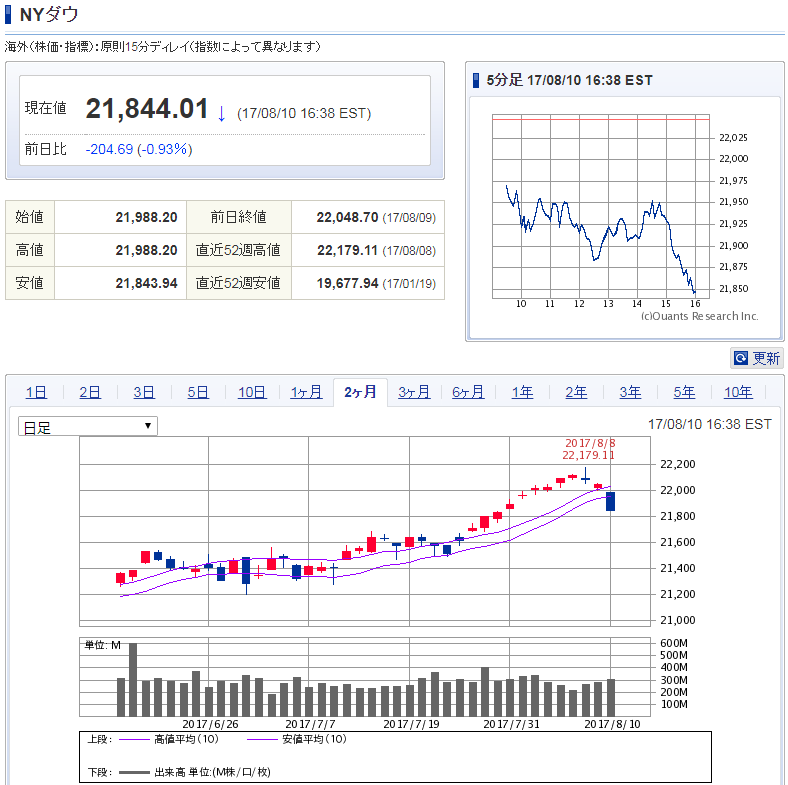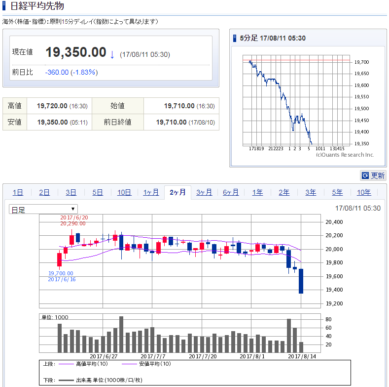 北朝鮮情勢が緊迫化し、8月限のSQ日の前日という絶妙なタイミングで、日経平均が急落し下げ幅は一時300円を超えることになりました。