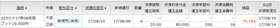 8月10日は前日よりも高値で取引が開始され、8月限のSQ値は19,825円92銭で権利放棄により建玉から1日で約8万円をゲットしました。お小遣い的な収入ですね。