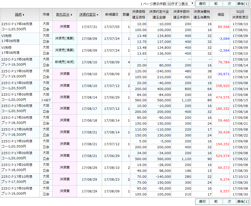 ボラリティが低いときに建玉を増やしてしまうと動き出してからが危ないと思ったので、物足りなさを感じつつも7月は我慢して正解でした。8月9日に北朝鮮情勢が緊迫化し急落したことで、6月下旬から7月中旬の日経平均が2万円台で上昇トレンドだった時に売建てしたコールの建玉で大きな利益が出ました。