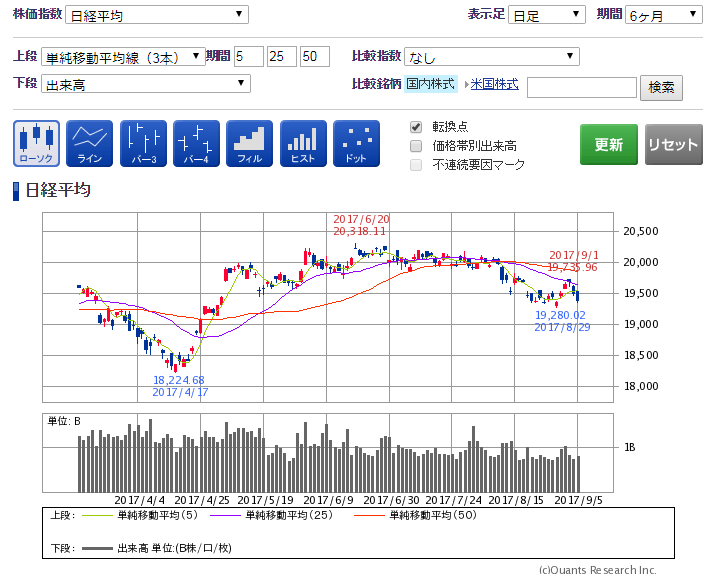 このまま19,500円前後で底を打って反発するのかと思っていたら、8月29日早朝の北朝鮮が弾道ミサイル発射で、日経平均が急落しました。