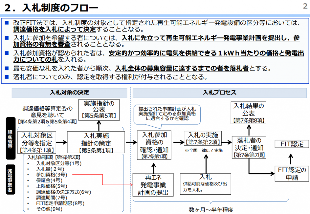 「入札制度については、改正FIT法上、経済産業大臣は、①買取単価について入札を行うことが国民負担の軽減につながる際に、②入札対象の電源区分等を指定することができ、その際には、③入札実施指針を策定することとしている。」