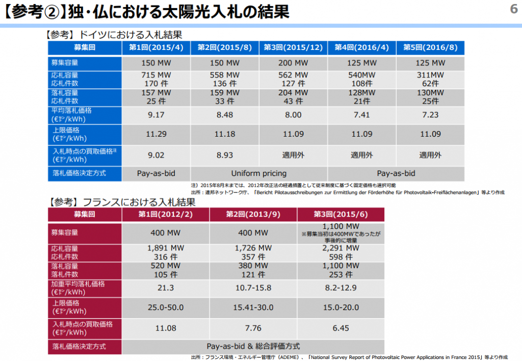 太陽光入札で先行するドイツやフランスでも、入札による市場競争で買い取り価格の低減が図られています。下記の資料を見ると、太陽光発電の先進国ドイツでは、1kwhあたり7ユーロセント台(10円程度)と、この価格で事業計画が成立することは日本よりも進んでいると感じました。