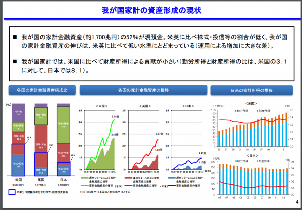 ここでの会社依存度は、総収入に占める給与収入の割合という意味ですので、会社依存度=会社の給与収入÷総収入です。データ上自営業の人も含んでいますが下記の金融庁の資料を参考にすると、勤労収入が占める割合は米国の4分の3に対して日本は8分の7で、約9割ととても高いことが分かります。
