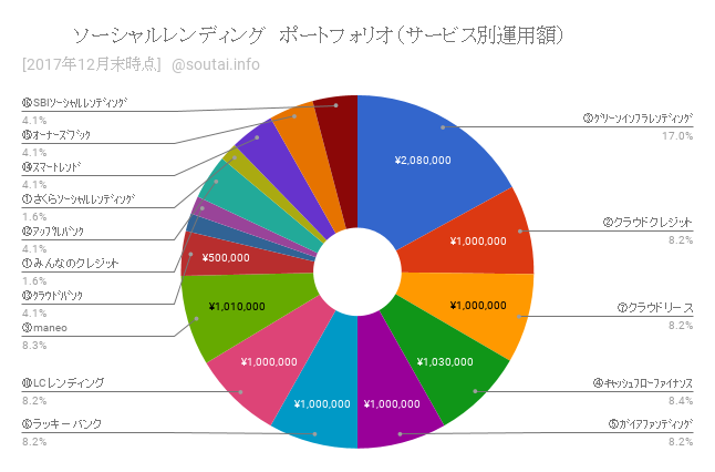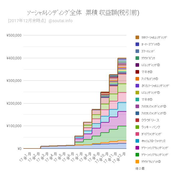 みんなのクレジットの案件(現在の投資額合計の約2%)については12月分は利金配分がない状況で、今後の貸し倒れリスクが高まっている状況です。債務不履行となれば、この案件以外の順調な投資案件の利金分配による収益が目減りしてしまいそうです。これを教訓に今後はさらに分散投資を推進してリスク低減を図っていきたいと思います。
