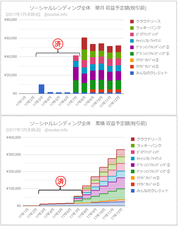 累積収益(税引前)については、現在の見通しでは2017年間で30万円ちょっとですが、50万円を目標に追加投資をしていくつもりです。インカムゲイン型の投資の魅力は、基本的に単月収益の変動が少なく累積収益が安定した右肩上がりとなることと、年間の収益の見通しが立てやすいこととですね。