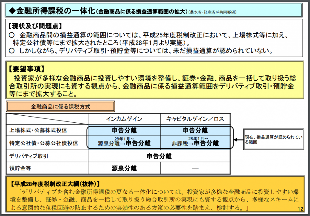 平成28年8月31日に金融庁が公表した「平成29年度税制改正要望項目」(「金融庁の平成29年度税制改正要望について 新しいウィンドウで開きます。 」参照)において、「金融所得課税の一体化(金融商品に係る損益通算範囲の拡大)」(農水省・経産省共同要望)として、「上場株式等」と「デリバティブ取引等(先物・オプション取引、FX、商品先物等)」との損益通算を認めることが要望として挙げられました。