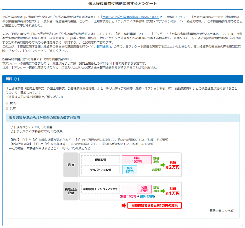 SBI証券は、このたび金融庁が公表した「平成29年度税制改正要望項目」(「金融庁の平成29年度税制改正要望について」参照)において、“上場株式等”と“デリバティブ取引等”との損益通算を認める要望について、個人投資家の皆様にとって非常に重要、かつ有利であり、必要不可欠な税制改正であると考えております。